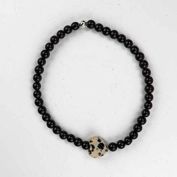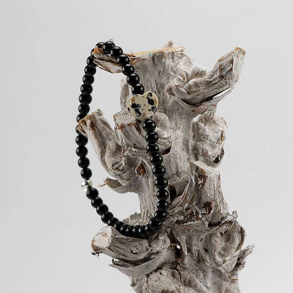 Deze armband is gemaakt met zwarte kralen en in het midden een leuke “dalmatiër” hartje. Geschikt voor een polsmaat van 17 cm.