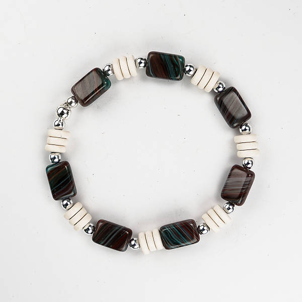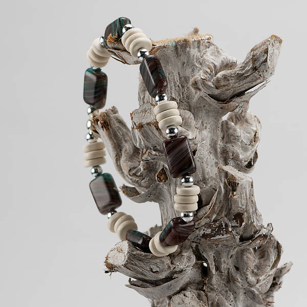 Deze armband is gemaakt met gemeleerde kraal in de kleur bruin/blauw en cremekleurige polymeerkralen voor een polsmaat van 17 cm.