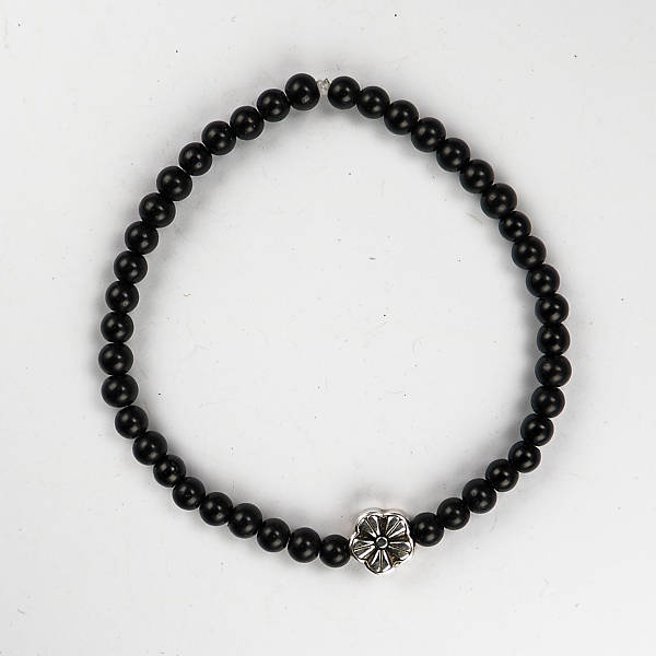 Deze armband is gemaakt met zwarte kraalen en in het midden een leuk bloemetje voor een polsmaat van 17 cm.