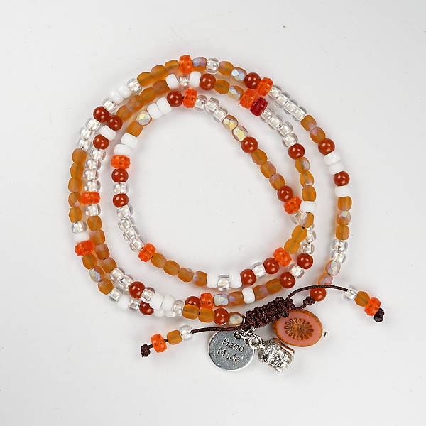 Deze armband is gemaakt met oranje glaskralen en witte miyuki rocailles 4 mm voor een polsmaat van 17 cm. Deze armband gaat 3 maal om de pols.