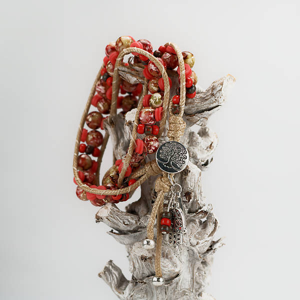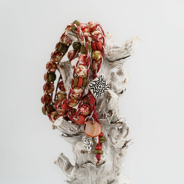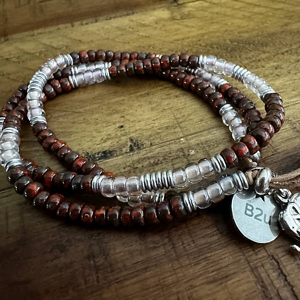 Een soortelijke uitvoering is te bestellen waarbij de basiskleuren hetzelfde blijven maar de compositie varieert zodat elke armband uniek blijft. Gaat 2maal om de pols.