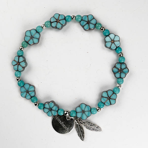 Deze armband is gemaakt met turquoise kraaltjes en bloemetjes voor een polsmaat van 17 cm.