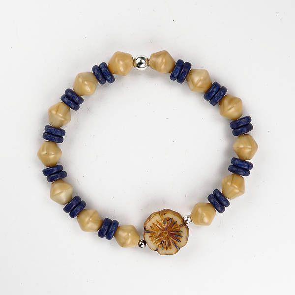 Deze armband is gemaakt met beige en blauwe kralen voor een polsmaat van 17. In het midden heeft deze armband een mooie Tsjechische bloem kraal.