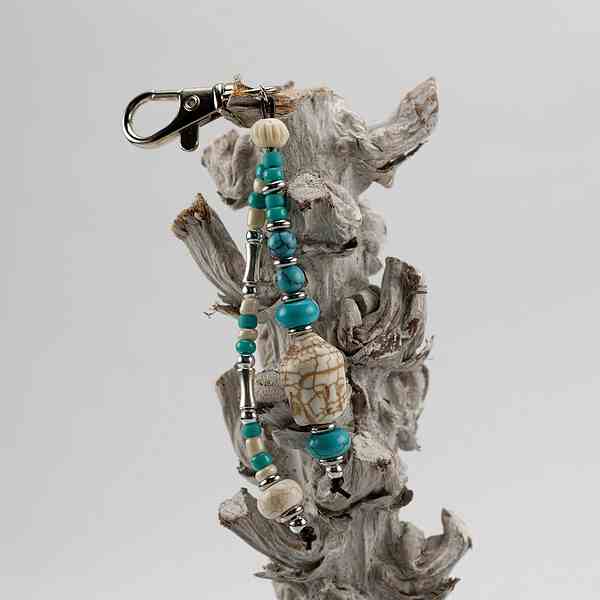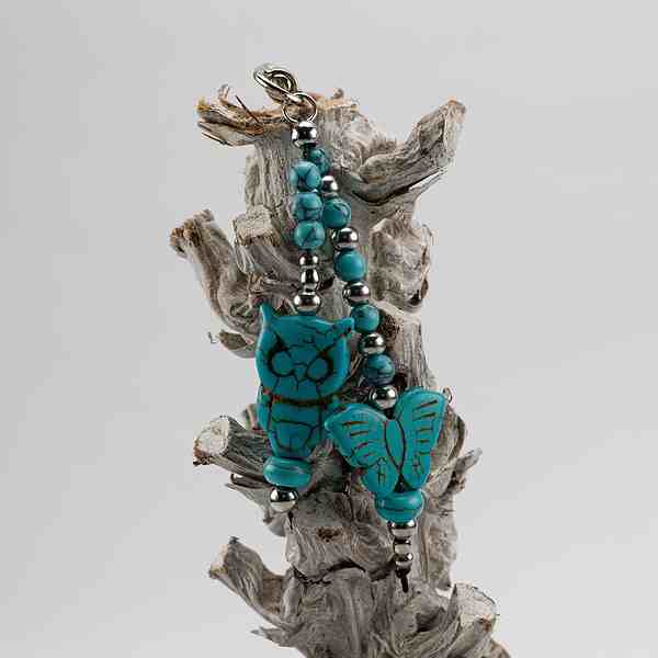 Is gemaakt met turquoIse kralen afgewisseld met zi;verkleurige kralen. Als blikvanger zijn 2 hele mooie kralen gebruikt in de vorm van een vlinder en uil.