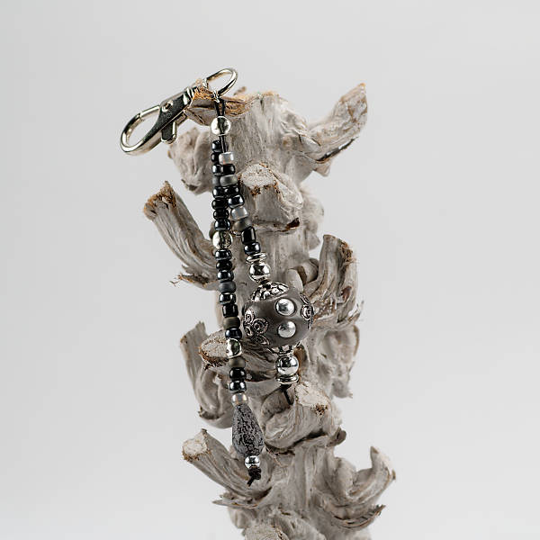 Is gemaakt met zwarte en grijze rocailles en hier en daar een zilverkleurige kraaltje. Als blikvanger is een mooie grote grijze kraal met een doorsnee van 2 cm gebruikt.
